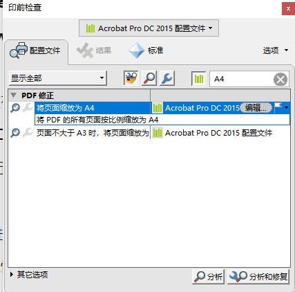 工具欄選擇“印刷制作-印前檢查-PDF修正”,選擇“將頁面縮放為A4”點擊“分析和修復”保存替換原文件即可。