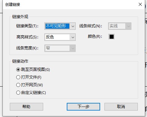(1)創建內部鏈接:在PDF文檔中制作內部鏈接時,我們可以在“編輯”菜單欄的“編輯文本和圖像”,點擊“鏈接”,下拉菜單選擇“添加/編輯網絡鏈接或文檔鏈接”,這時鼠標箭頭變成空心十字狀態,框選出要創建鏈接的文本,在彈出的選項卡里,鏈接類型選不可見矩形;線條樣式選擇實線;高亮樣式選反色;顏色選黑色;線條寬窄選窄。鏈接動作選跳至頁面視圖,點擊下一步,彈出設置目的頁位置選項卡,鼠標滑動或輸入頁碼到目的頁后,點擊設置鏈接按鈕。